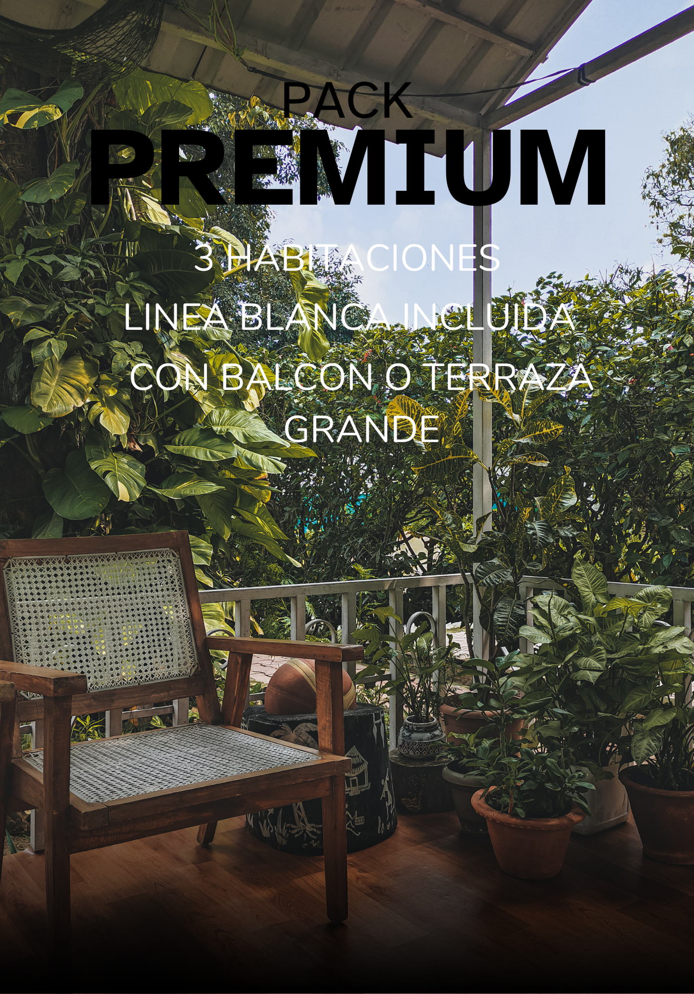 Pack premium para vivienda de 3 habitaciones, con mobiliario para balcón o terraza grande, con linea blanca incluida.