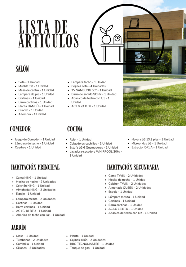 Pack premium para vivienda de 2 habitaciones, con mobiliario para jardín, con linea blanca incluida.